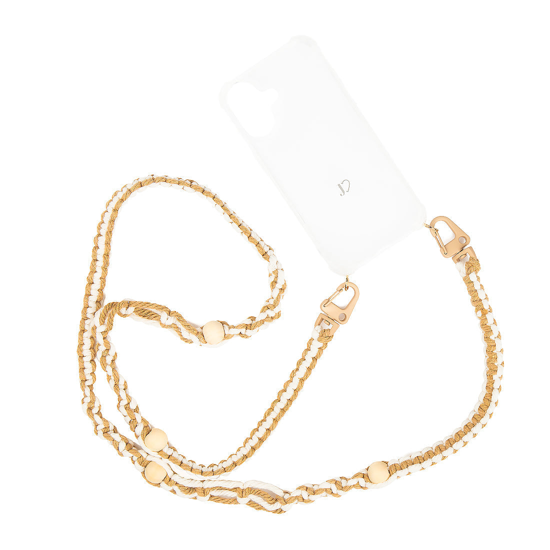 Produkt składa się z silikonowego casa na telefon w kolorze transparentnym, okucia metalowego oraz plecionego z naturalnych nici  sznurka w  kolorze czarnym z kremowymi kuleczkami. Sznurek na odpinanych karabińczykach w kolorze czarnym.