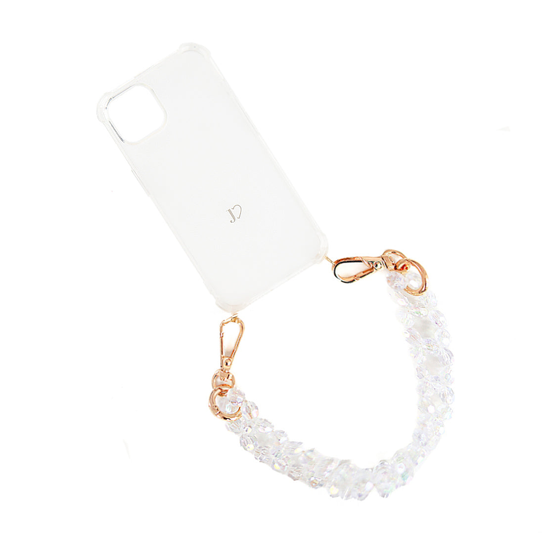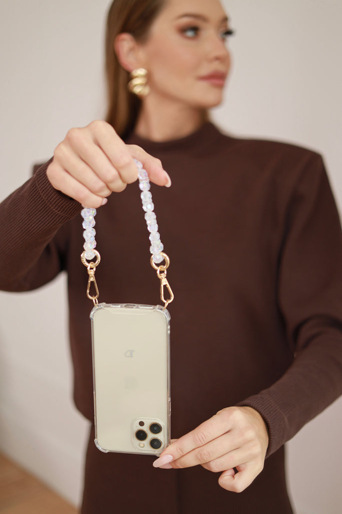 Produkt składa się z silikonowego casa na telefon w kolorze transparentnym, okucia metalowego oraz krótkiego odpinanego strapa w kolorze ecu -przeźroczystym z kamieni sztucznych.