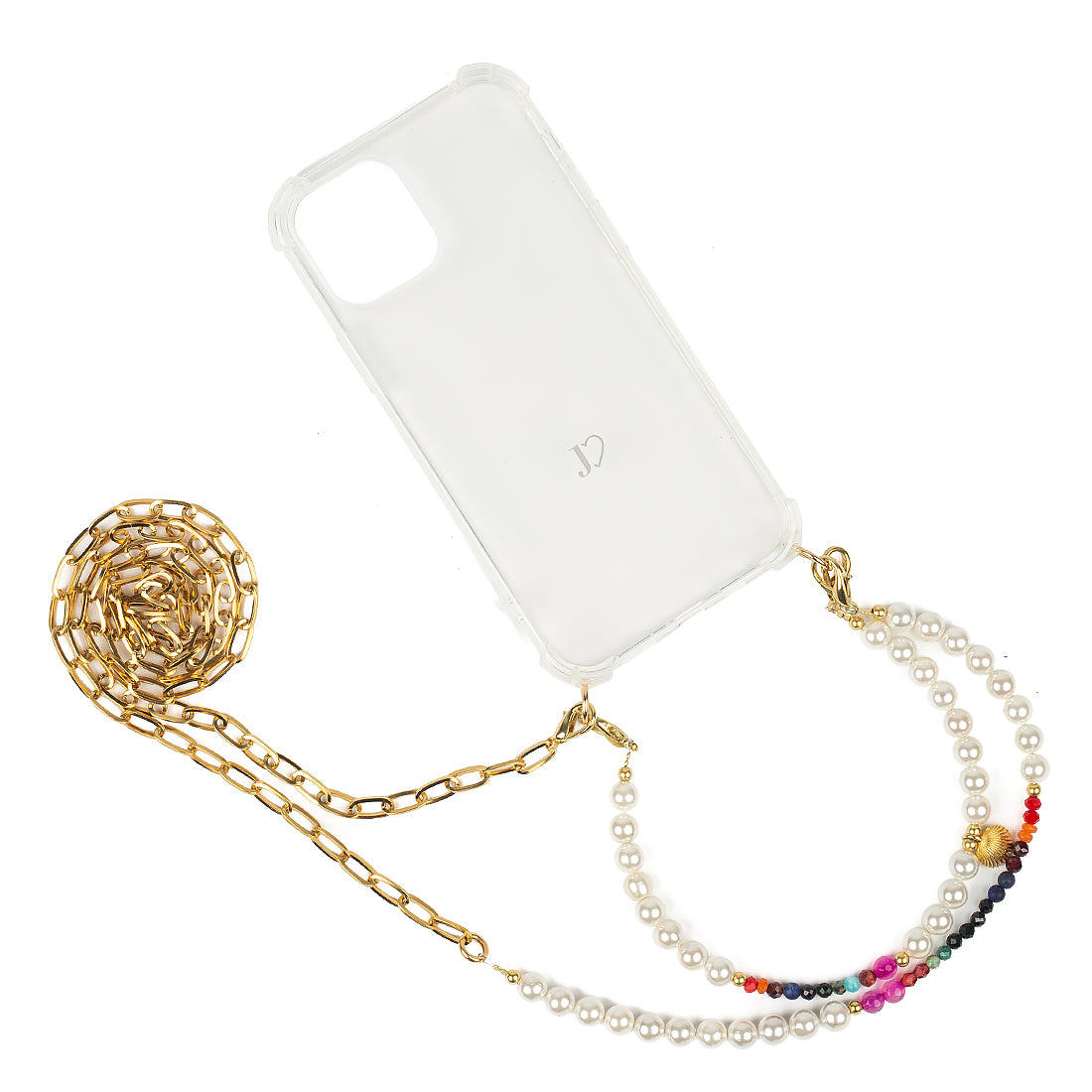Zestaw składa się z silikonowego etui w kolorze transparentym wraz z odpinanym długim i krótkim sznurem wykonanym z pereł z Majorki oraz łańcucha ze stali chirurgicznej  i kolorowych kamieni naturalnych wraz z mocowaniem w kolorze złotym. Perły mogą się każdorazowo różnić - są to kamienie naturalne i mogą przybierać nieznacznie różniące się kształty. Łańcuch także lekko odbiegać od tego na zdjęciu.