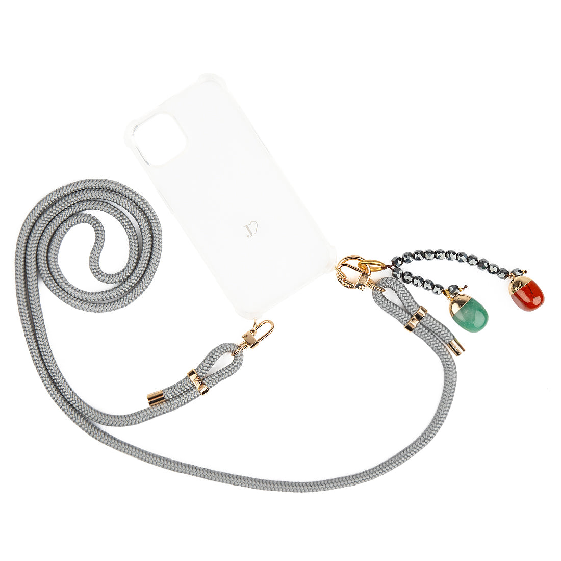 Produkt składa się z silikonowego casa na telefon w kolorze transparentnym, okucia metalowego oraz sznurka w kolorze szarym z odczepianą krótką zawieszką wykonaną z kamieni naturalnych - hematytów zakończonymi dużymi sztucznymi w modnych kolorach jesieni - zieleni i bursztynu.